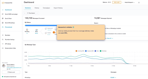 Deliverability is another key strength. Messente’s infrastructure is optimized for reliability, with intelligent routing and failover channels to ensure messages get through even if one route experiences trouble.