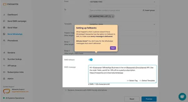 Firstly, Messente is omnichannel. Unlike EZ Texting, which primarily handles SMS and MMS, Messente lets you engage users on WhatsApp and Viber through the same platform. This is a huge advantage if your audience includes international users who prefer chat apps over SMS.