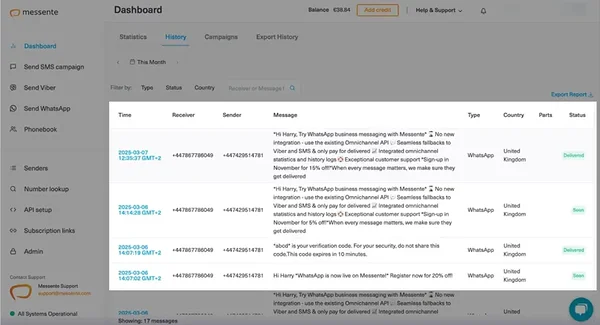 The platform provides access to detailed delivery reports and messaging statistics, complete with error codes and timestamps. You can view campaign history and performance on the dashboard or pull data via a Statistics API for custom analysis. This transparency makes it easy to monitor ROI and troubleshoot any delivery issues ASAP.