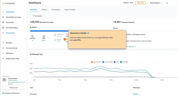 Additionally, while the platform has good automation features, extremely advanced workflows might require custom handling. These are relatively minor points, and Messente’s team is very responsive in assisting with such needs, but it’s an area for potential improvement, nevertheless.