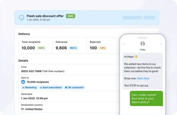 Messente has a 98% global SMS delivery rate thanks to intelligent routing and partnerships with about 1,000 operators in 197 countries. It can send up to 9,000 messages per minute, making it great for large or urgent campaigns.